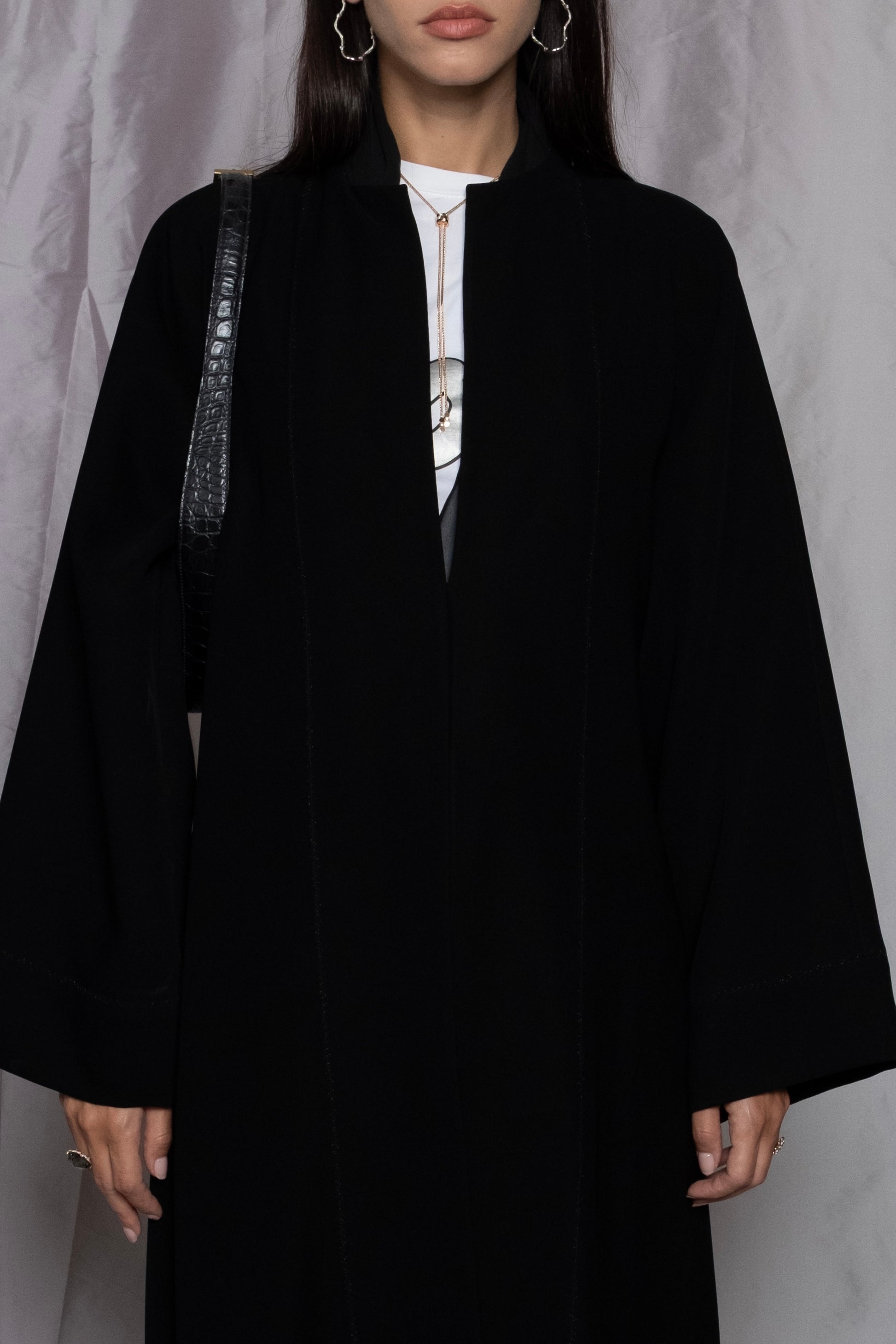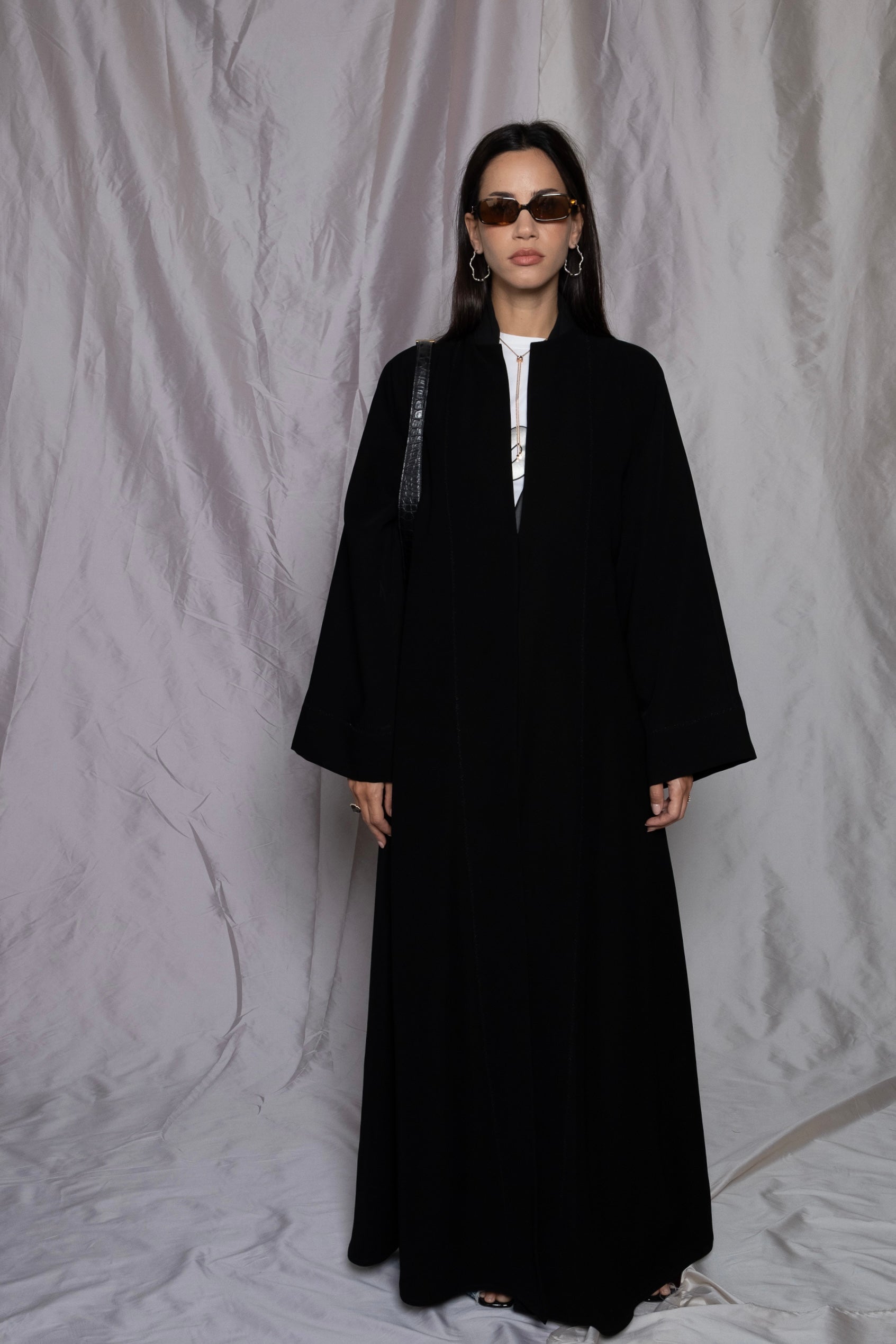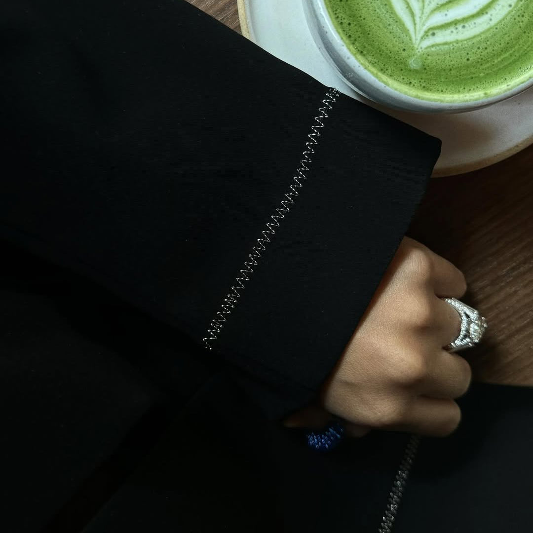 this abaya is the all time OG, a bestseller too! made of gorgeous triple georgette fabric, the flow of the fabric speaks for itself, this high neck abaya can be dressed up or down effortlessly, and the hint of ‘thedaily’ self tone signature metallic zig zag stitch down the front makes it complete.