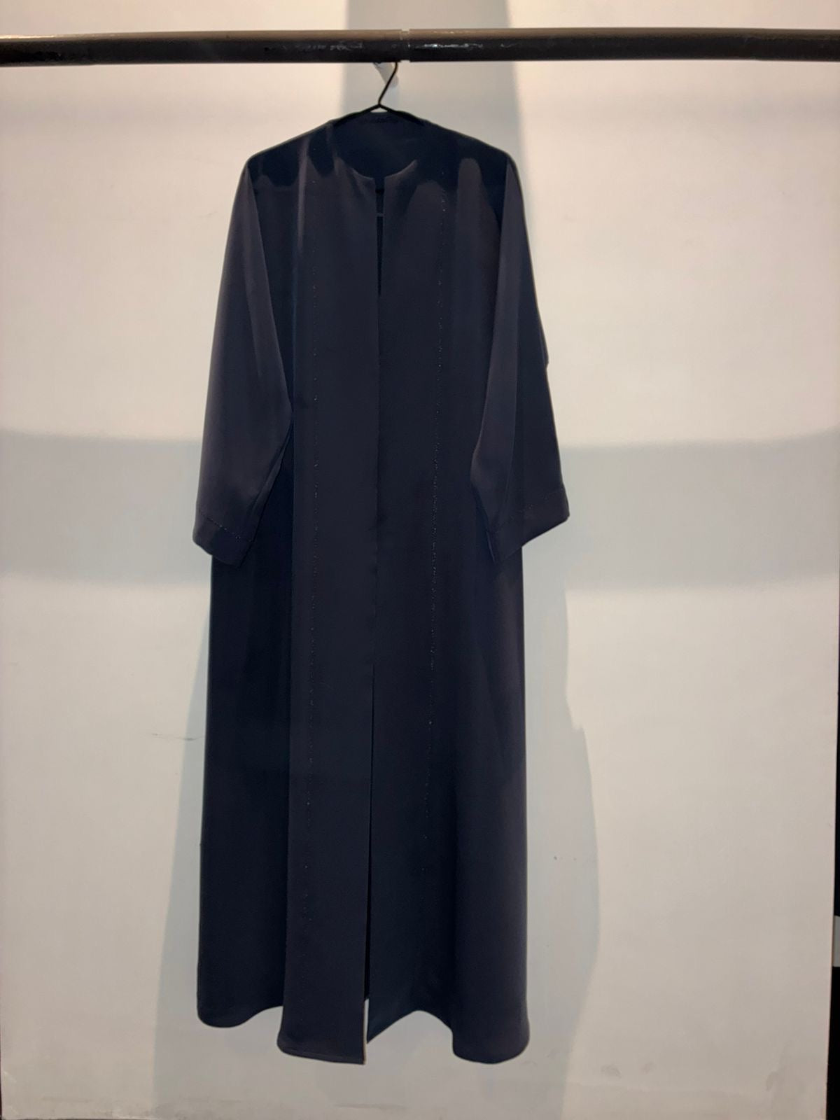 this abaya is the all time OG, a bestseller too! made of gorgeous triple georgette fabric, the flow of the fabric speaks for itself, this high neck abaya can be dressed up or down effortlessly, and the hint of ‘thedaily’ self tone signature metallic zig zag stitch down the front makes it complete.