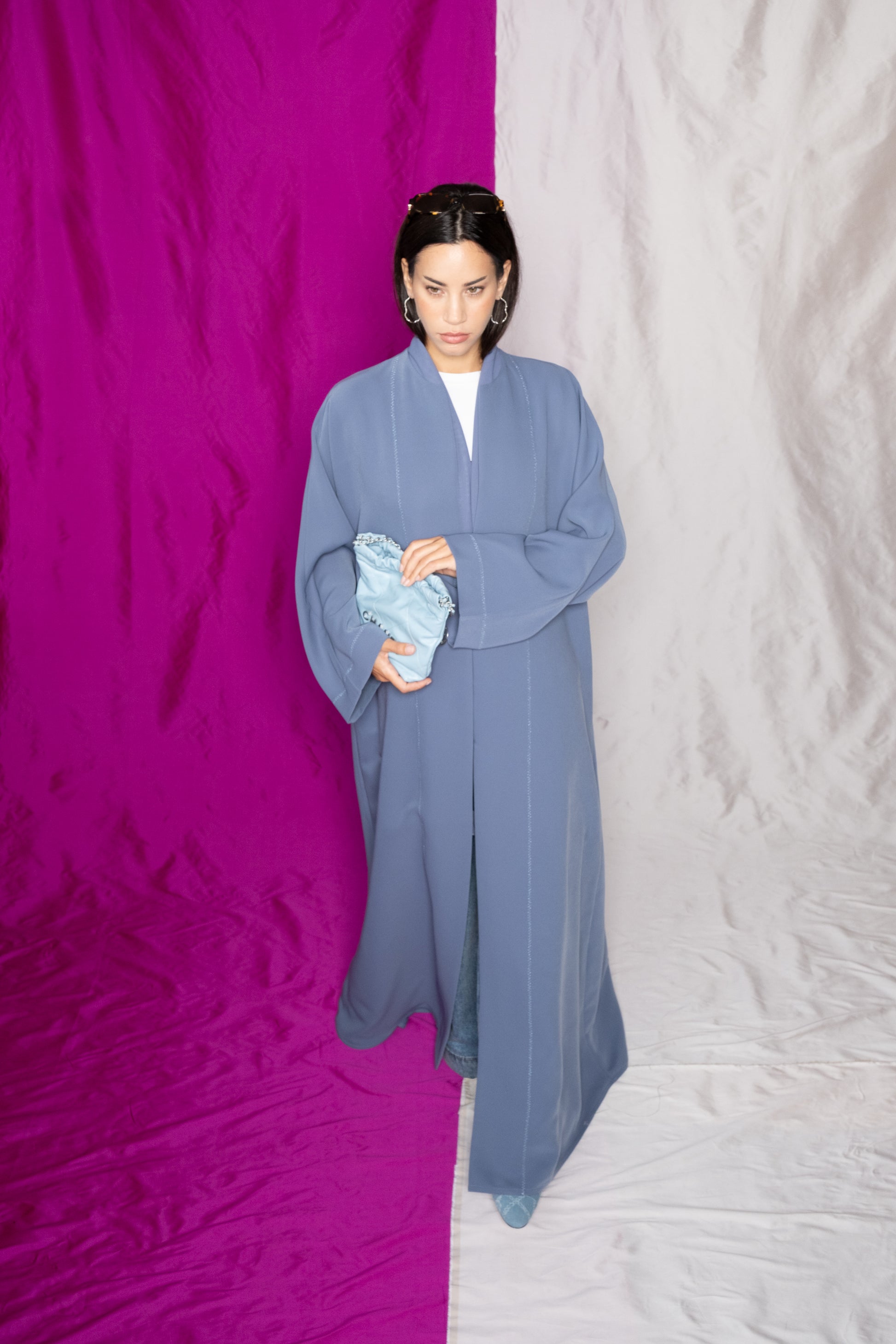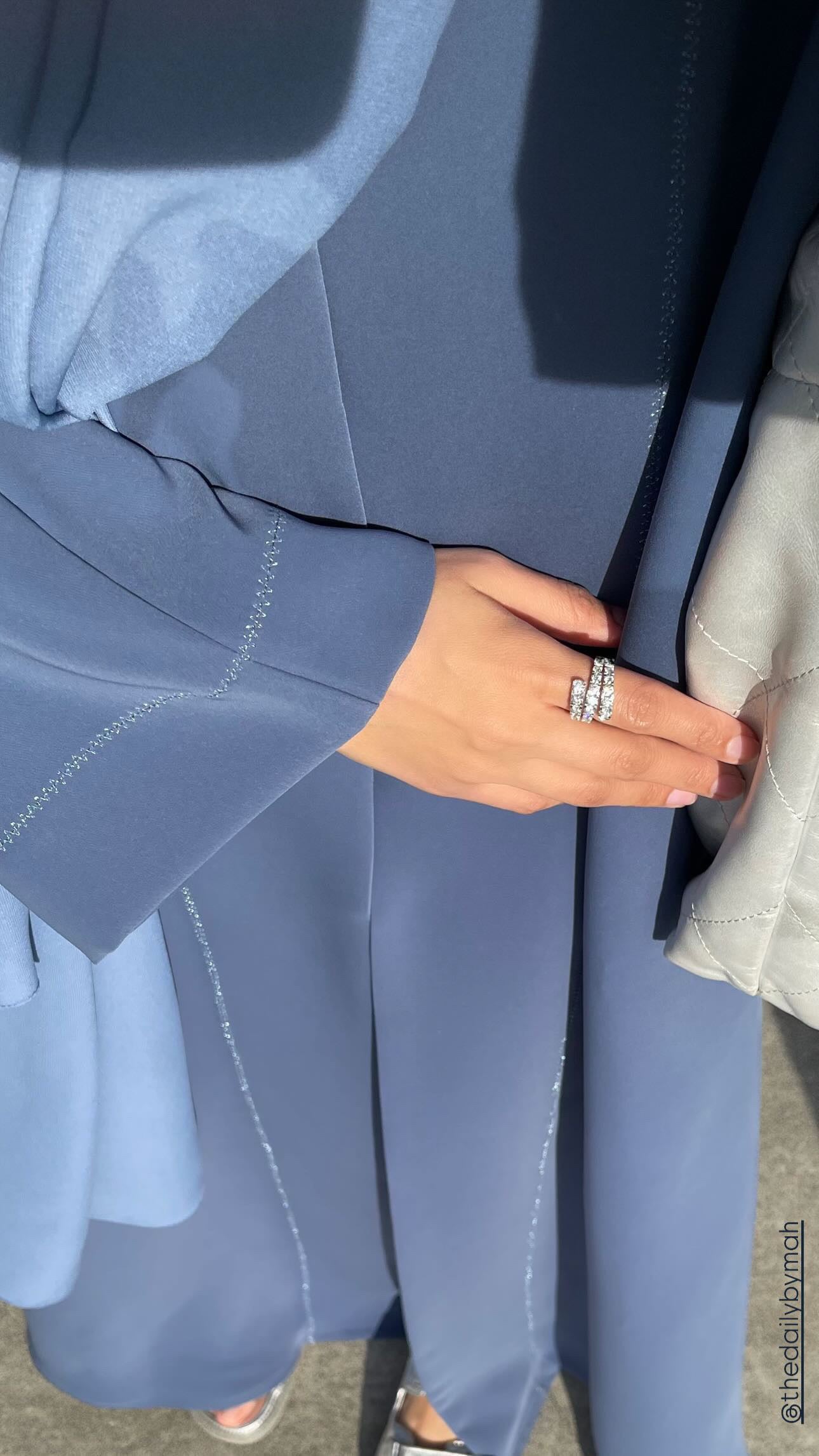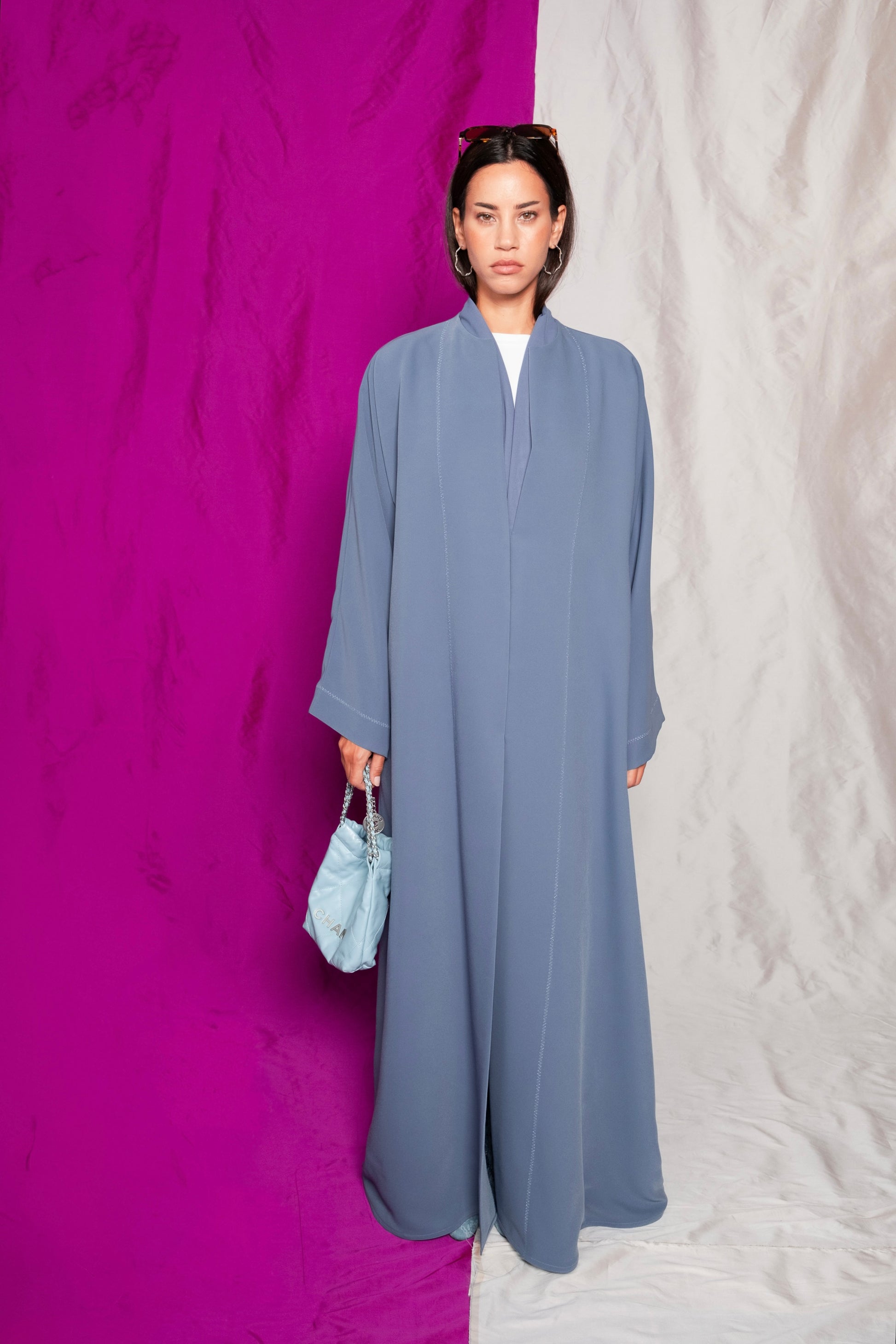 this abaya is the all time OG, a bestseller too! made of gorgeous triple georgette fabric, the flow of the fabric speaks for itself, this high neck abaya can be dressed up or down effortlessly, and the hint of ‘thedaily’ self tone signature metallic zig zag stitch down the front makes it complete.