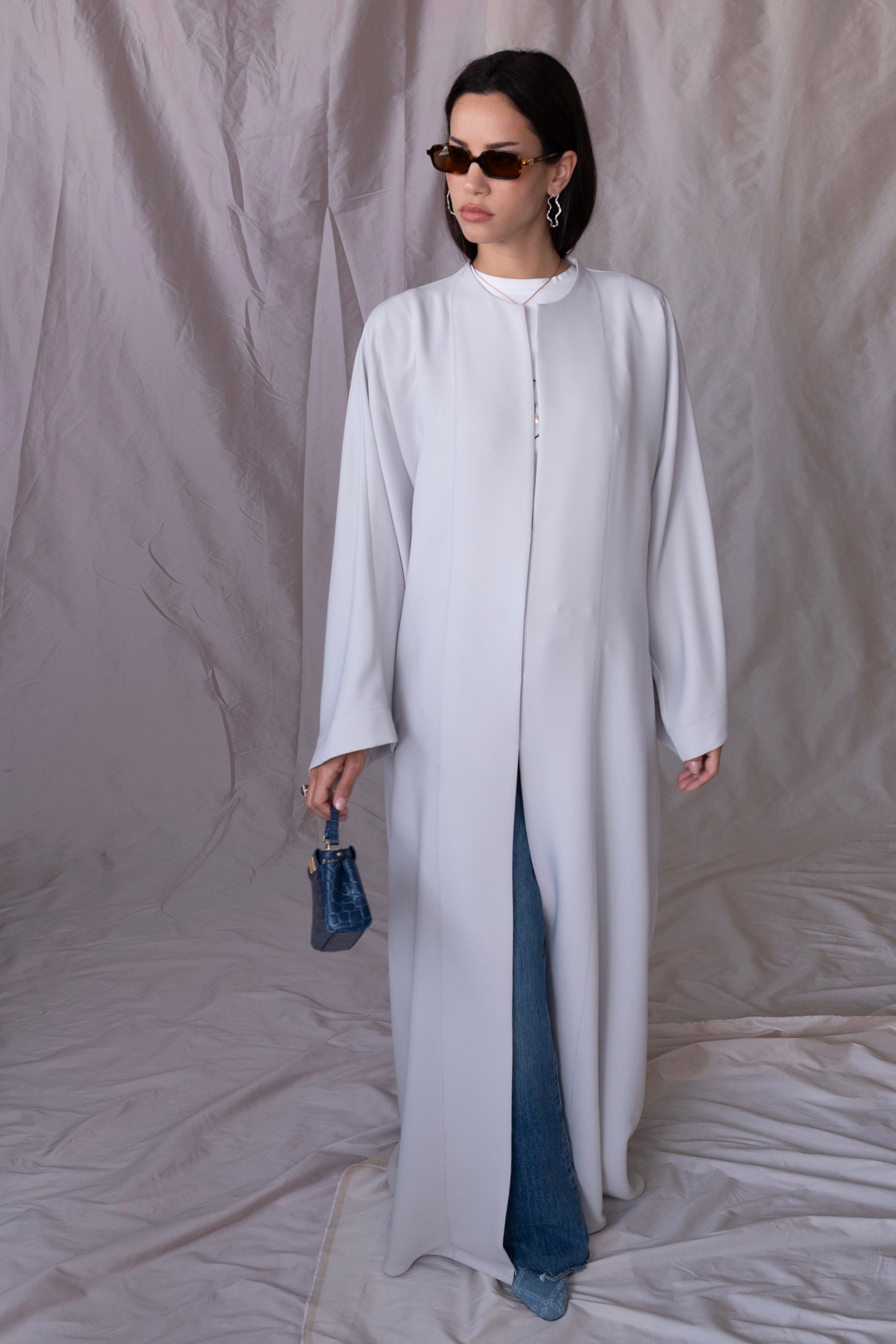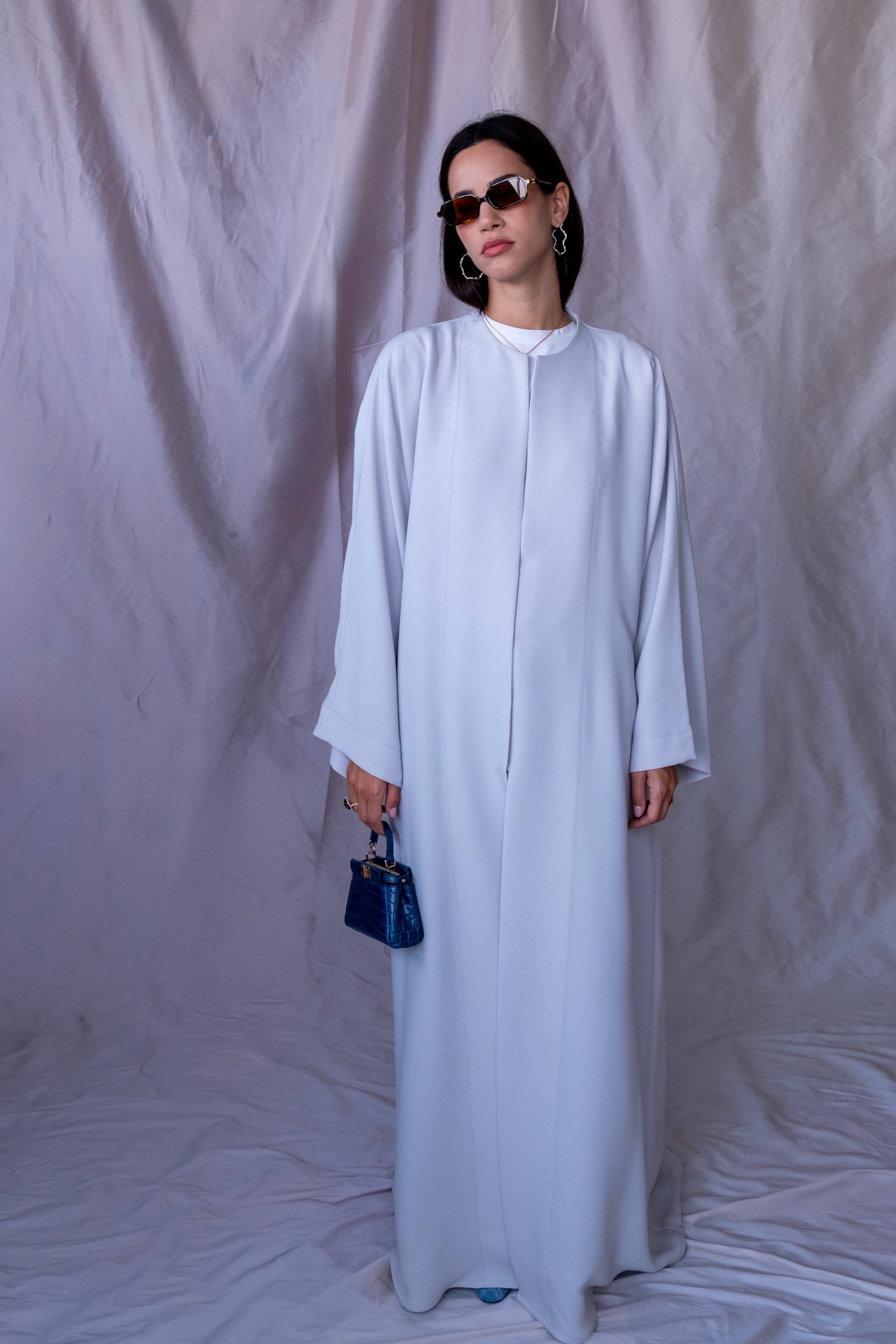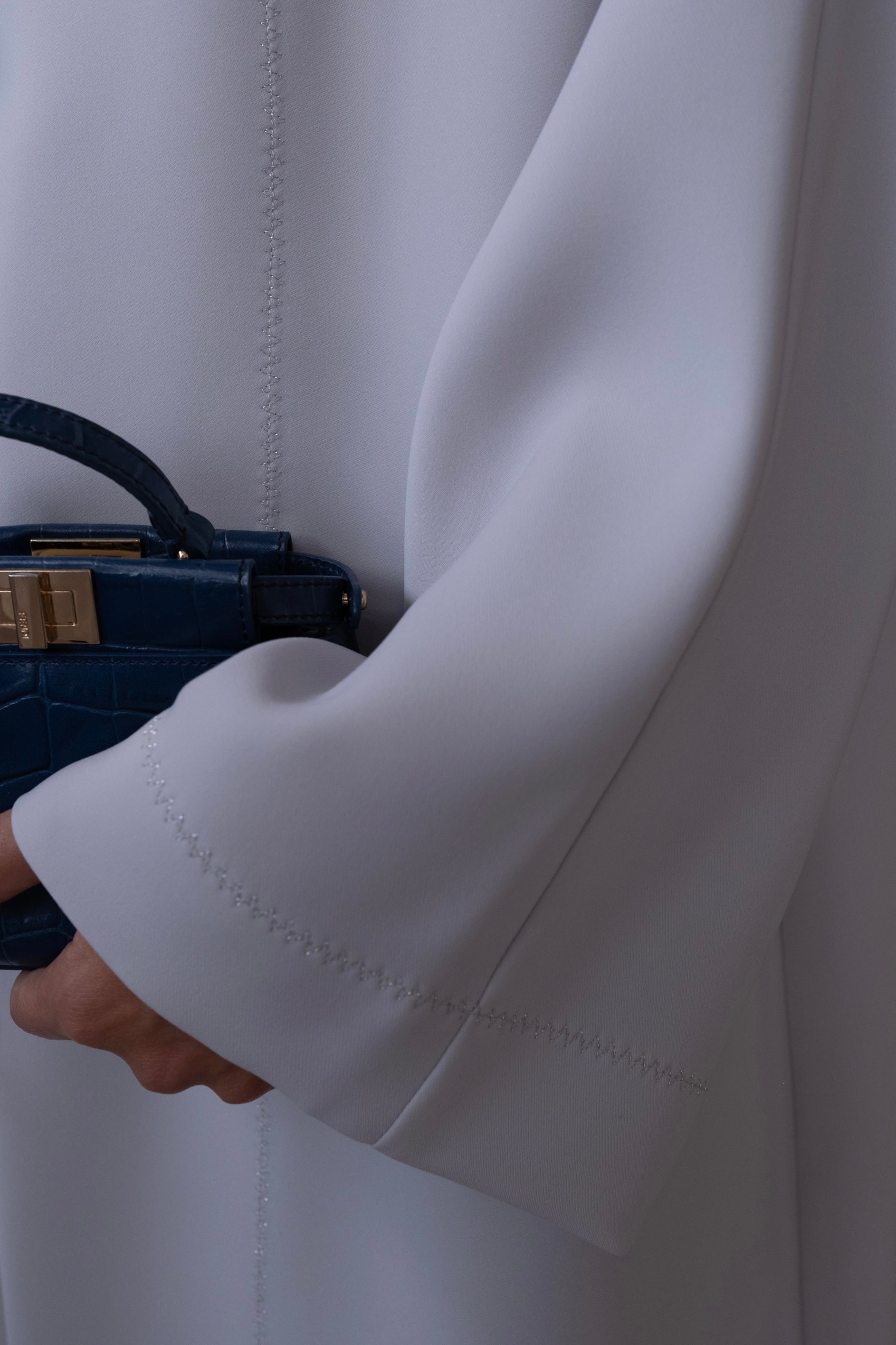 this abaya is the all time OG, a bestseller too! made of gorgeous triple georgette fabric, the flow of the fabric speaks for itself, this high neck abaya can be dressed up or down effortlessly, and the hint of ‘thedaily’ self tone signature metallic zig zag stitch down the front makes it complete.